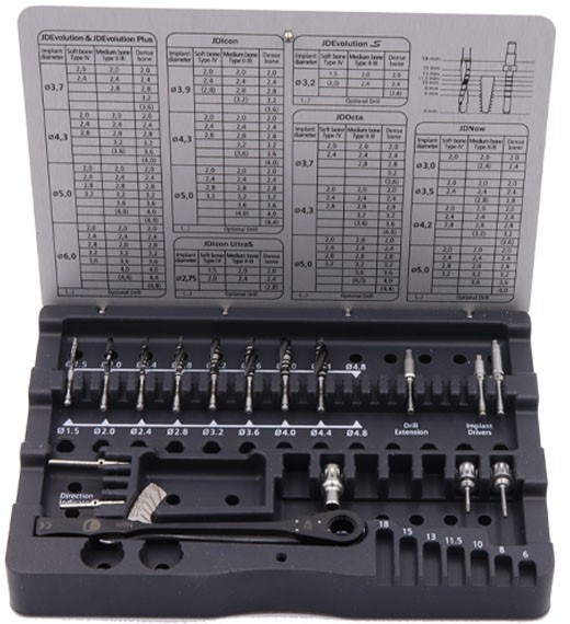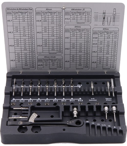 Включає 8 стандартних свердел від Ø1,5 до Ø4,4, подовжувач свердла, два покажчики повороту, короткий і довгий, хірургічний адаптер для JDTorque, 6 упорів для свердла від L6 до L15, динамометричний ключ JDTorque, дві протезні викрутки та дві хірургічні відверти для встановлення імплантатів, відповідно короткі та довгі.